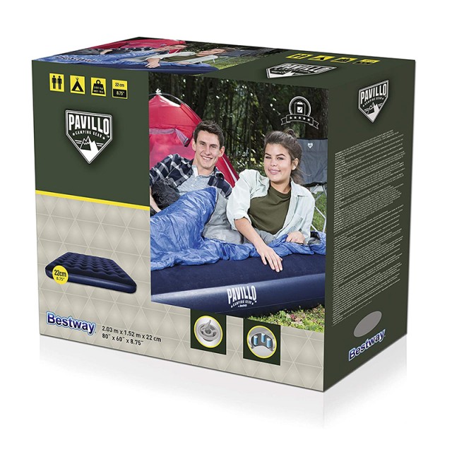 تشک بادی 2 نفره بست وی مدل 67003 Pavillo یکی از انواع تشک بادی کمپینگ دو نفره تولید شده توسط شرکت بست وی بوده که جهت استفاده در سفر های طبیعت گردی ، استفاده در محل کار و منزل عرضه شده است. این تشک بادی در واقع در دو مدل با عرض های متفاوت عرضه شده که به راحتی دو نفر در سنین بزرگسال را در خود جای می دهد. تشک بادی امروزه یکی از بهترین جایگزین انواع تشک پشمی و غیر بادی شده زیرا دارای مزیت هایی همچون داشتن حجم و وزن کم و راه اندازی سریع می باشد از همین رو بیشتر در مسافرت ها مختلف بخصوص کمپینگ در داخل چادر سفری و خودرو های آفرود استفاده می شود. این محصول دارای ابعاد (طول: 203 سانتی متر ، عرض: 152 سانتی متر ، ارتفاع: 22 سانتی متر) بوده که ابعاد راه اندازی شده این کالا محسوب می شود. با توجه به این ابعاد تحمل وزن تشک بادی دو نفره پاویلو به 300 کیلوگرم رسیده که می توان با خیالی آسوده از این محصول برای افراد سنگین وزن نیز استفاده کنید. البته مقدار باد وارد شده به بدنه در تحمل وزن نیز تاثیر گذار خواهد بود از همین رو هر چقدر باد تشک را افزایش دهید به دلیل فشار وارد شده به درز ها و لایه های داخلی از مقدار تحمل وزن کاسته خواهد شد. طراحی بدنه در قسمت داخلی شامل لایه هایی ضخیم بوده که به صورت موازی و پشت سر هم تعبیه شده اند. این لایه ها فشار های ناشی از وزن افراد و باد بدنه را تحمل کرده و مانع از فرو رفتن سطح رویه در زمان استفاده خواهد شد. همچنین برای سطح رویه نیز از طراحی مواج و مشبک به کار برده شده تا علاوه بر پوشش بهتر اعضای بدن با عبور جریان هوا از خود در برابر تعریق بالای مصرف کنندگان جلوگیری لازم را به عمل آورد.