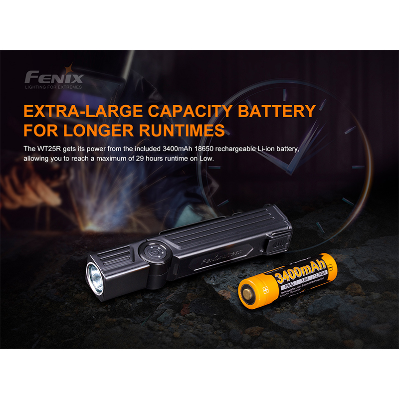 باتری لیتیوم یونی چراغ قوه فنیکس مدل WT25R مدت زمان طولانی روشنایی را فراهم میکند. بسته به تنظیمات روشنایی، این چراغ قوه میتواند تا ۳۰ ساعت استفاده مداوم را در حالت کمنور فراهم کند.