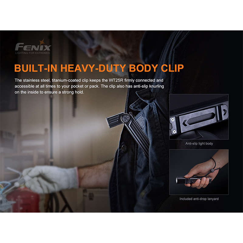 چراغ قوه فنیکس WT25R با بدنهای ساخته شده از آلیاژ آلومینیوم ضد زنگ و مقاوم در برابر ضربه، میتواند در شرایط سخت محیطی به خوبی عمل کند. این مدل همچنین ضد آب است و میتواند در شرایط بارانی و حتی غوطهوری کوتاه مدت در آب به کار خود ادامه دهد.
