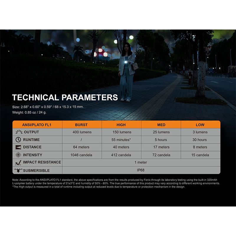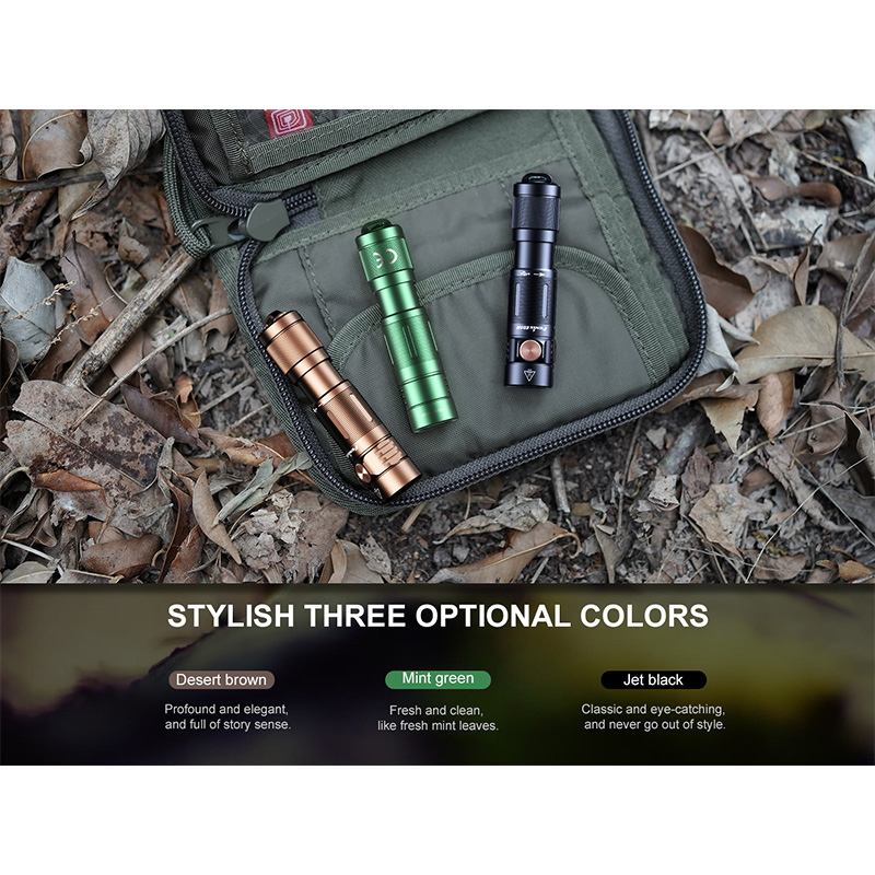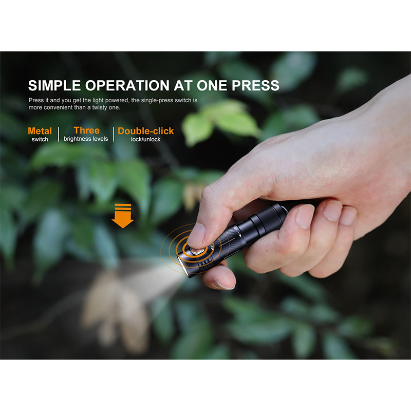 چراغ قوه E05R با ابعاد کوچک و وزن سبک خود، به راحتی در جیب یا کیف شما جا میشود. طراحی آن به گونهای است که حتی با یک دست نیز به راحتی قابل استفاده است، و همچنین دارای یک حلقه برای اتصال به کلیدها یا کیف میباشد. ابعاد کلی این محصول برابر است با 6.8 × 1.5 × 1.5 سانتی متر و همچنین وزنی برابر با 24 گرم دارد که وزنی ایده آل برای این محصول می باشد.